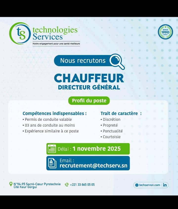 Technologies Services (Dakar) recrute un Chauffeur / Directeur Général : permis valide, minimum 3 ans d’expérience. Envoyez votre CV à recrutement@techserv.sn avant le 1er novembre 2025.